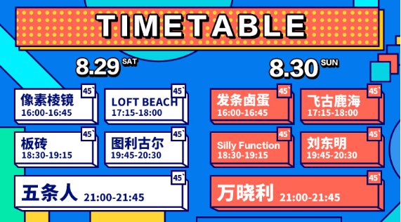 此次音乐节不仅请到了这个夏天炙手可热的五条人乐队,还有万晓利、刘东明、图利古尔、Silly Function、板砖、LOFT BEACH、飞古鹿海、像素棱镜、发条卤蛋等知名音乐人将带着他们的乐队与观众一起重温摇滚岁月。