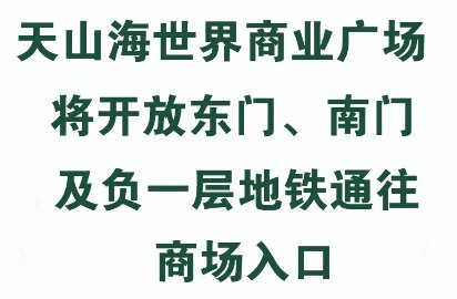 天山海世界商业广场将开放东门、南门及负一层地铁通往商场入口。