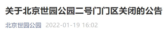 为保障2022年北京冬奥会和冬残奥会的顺利进行,根据筹办工作要求,北京世园公园二号门门区将于2022年1月20日关闭,恢复开放时间另行通知,请游客前往公园一号门入园。