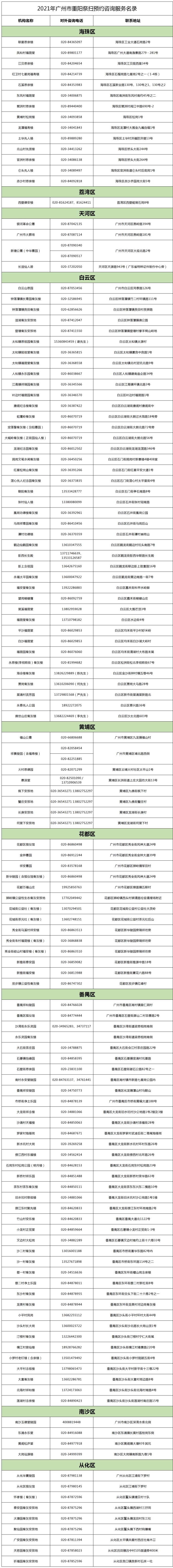 如需咨询清明祭扫相关情况,可以在下表查找对应的广州市重阳祭扫场所咨询服务电话(在正常工作时间内接听服务)。