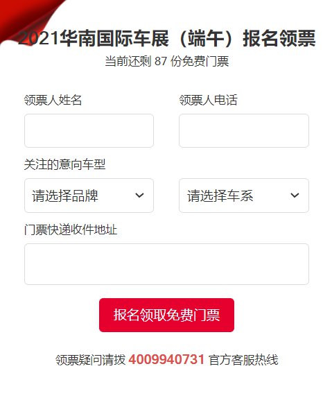 注:网友报名可免费领取个人门票1张及家庭套票一份(套票4张一组),数量有限,先领先得。成功报名后,48小时内车展组委会客服会电话与您核实收件信息,并寄出车展门票(现场60元/张)及1000元购车代金券+200元红包券,不包邮。