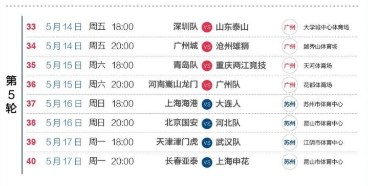 为了备战月底的40强赛,国足新一期集训时间提前,2021年5月9日确定中超第5轮广州队及北京国安的比赛场次将延期至8月举行,其他场次未定。
