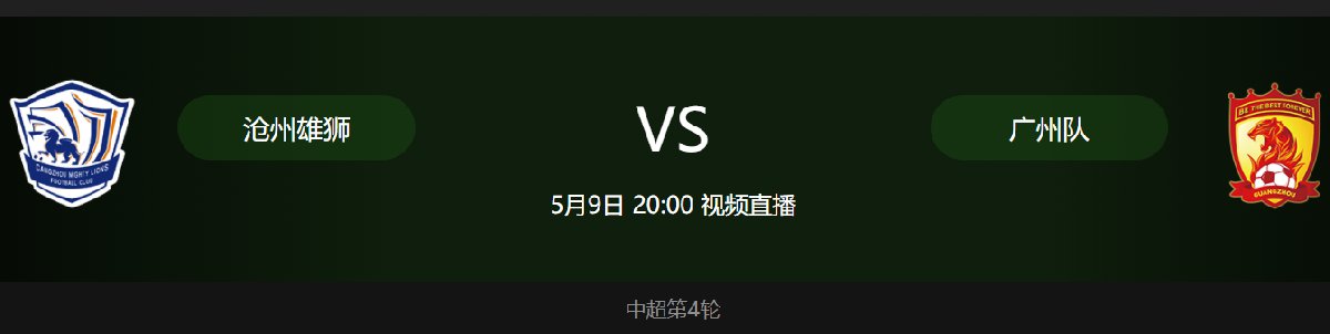 2021年中超联赛第4轮沧州雄狮vs广州队,将于5月9日晚20点在广州花都体育场举行。2021赛季中超已经拉开战幕,第4轮在广州赛区出战的八支球队分别是广州队、广州城、山东泰山、青岛队、深圳队、沧州雄狮、河南嵩山龙门、重庆两江竞技球队。