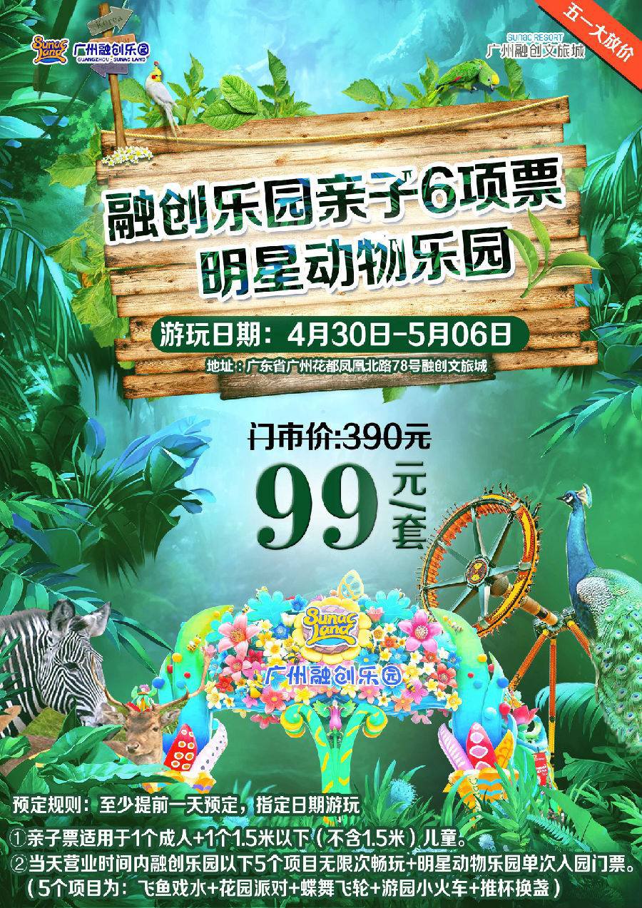 2021年5月1日-5月5日五一期间,广州融创乐园6项(含明星动物园)亲子票只需99元,门市价390元。广州融创乐园项目位于广东省广州市花都区凤凰北路78号,项目占地总面积约220万平方米,净用地面积约159万平方米,于2019年6月15日正式开园 。