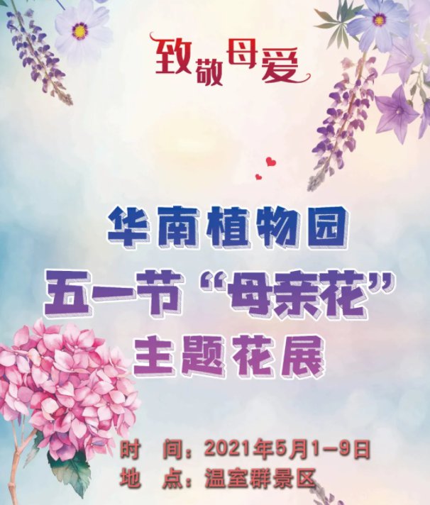 2021年5月1日至5月9日,广州华南植物园将在温室群景区举办五一节“母亲花”主题花展活动!广州华南植物园游览区全年开放,全年无休,开放时间:7:30-17:30。请携带身份证到现场实名购票(可微信支付)。入园请佩戴口罩,配合测温。