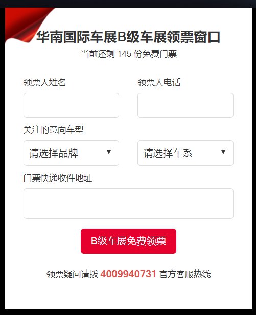 登录官网(点击进入),填写领票人姓名、电话、关注的品牌车型、门票收件地址后即可免费报名领取门票。门票将快递到家长手上,但需要支付快递费。