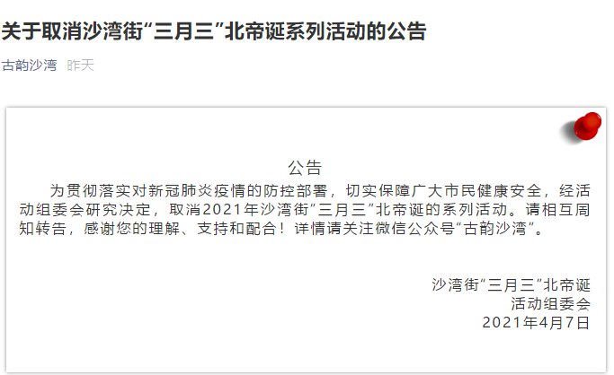 4月7日,广州市番禺区沙湾街“三月三”北帝诞活动组委会发布信息称,为贯彻落实对新冠肺炎疫情的防控部署,切实保障广大市民健康安全,经活动组委会研究决定,取消2021年沙湾街“三月三”北帝诞的系列活动。