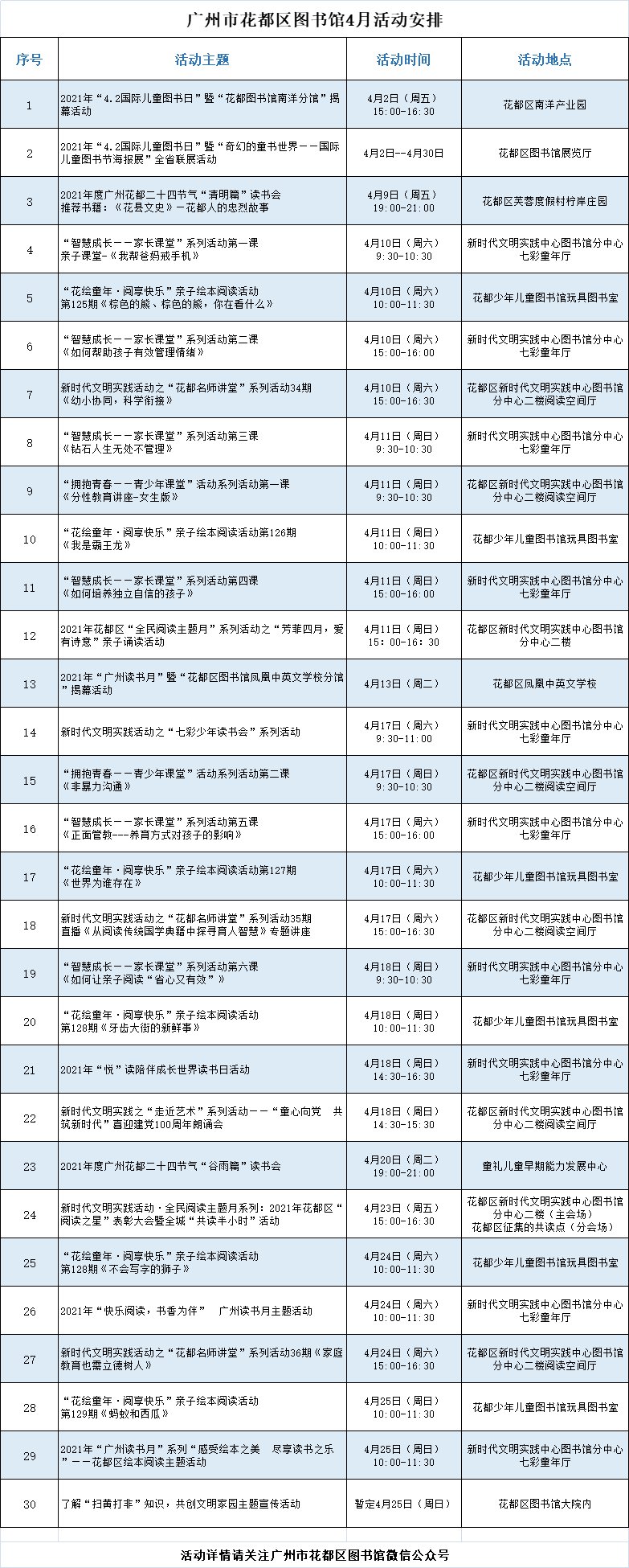 广州花都区图书馆2021年4月活动汇总表(广州花都图书馆开放时间)