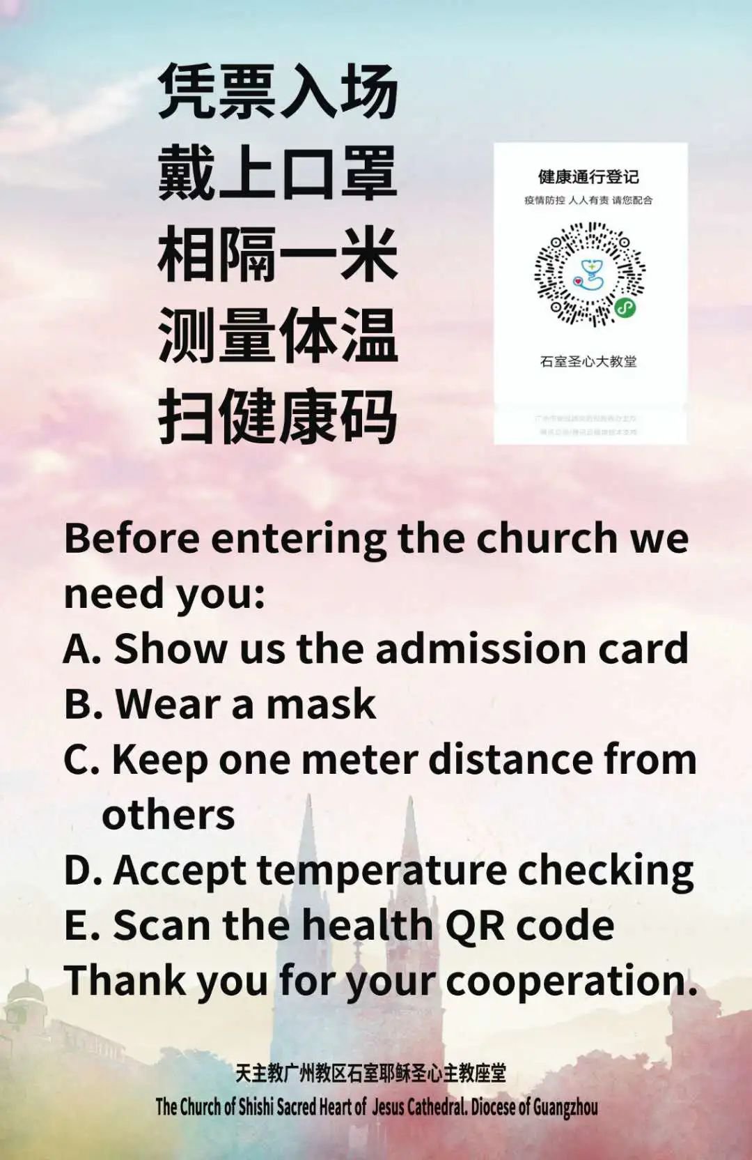 在圣堂恢复开放,圣事恢复举行的特殊时日,务必配合堂区制定的各项制度、须知及要求,凭票入堂、有序进堂。