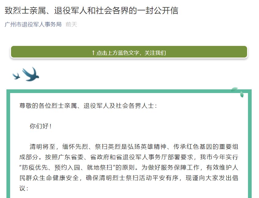 广州市退役军人事务局于2021年3月24日晚发布《致烈士亲属、退役军人和社会各界的一封公开信》,明确广州市今年实行“防疫优先、预约入园、就地祭扫”的原则,清明前后各地退役军人事务部门原则上不组织跨省、跨市异地祭扫活动,鼓励烈士亲属、退役军人和社会各界人士通过就地祭扫、网上祭扫等形式寄托哀思。