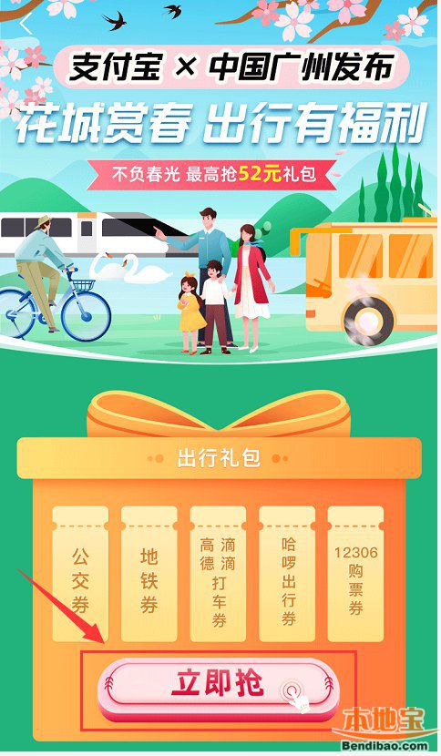 2、进入支付宝x中国广州发布“花城赏春 出行有福利”页面,点击“立即抢”,一键领取踏春出行礼包。