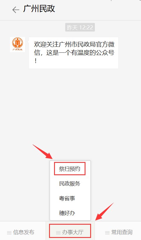 1、扫码关注“广州民政”公众号,点击菜单栏 “办事大厅—祭扫预约”