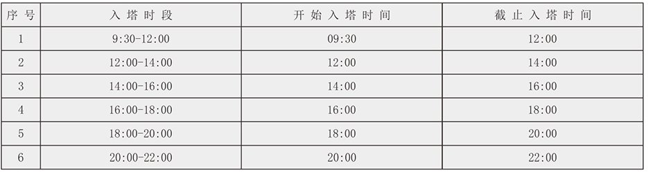 备注:请留意各观光游览时段的截止入塔时间,因游客个人原因错过截止入塔时间不能入塔,造成的损失需由游客自行承担。