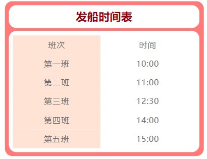 周六日增加16:00班次。实际发船时间按游客数量及包船团队数量进行调整,因天气原因停航另作通知。