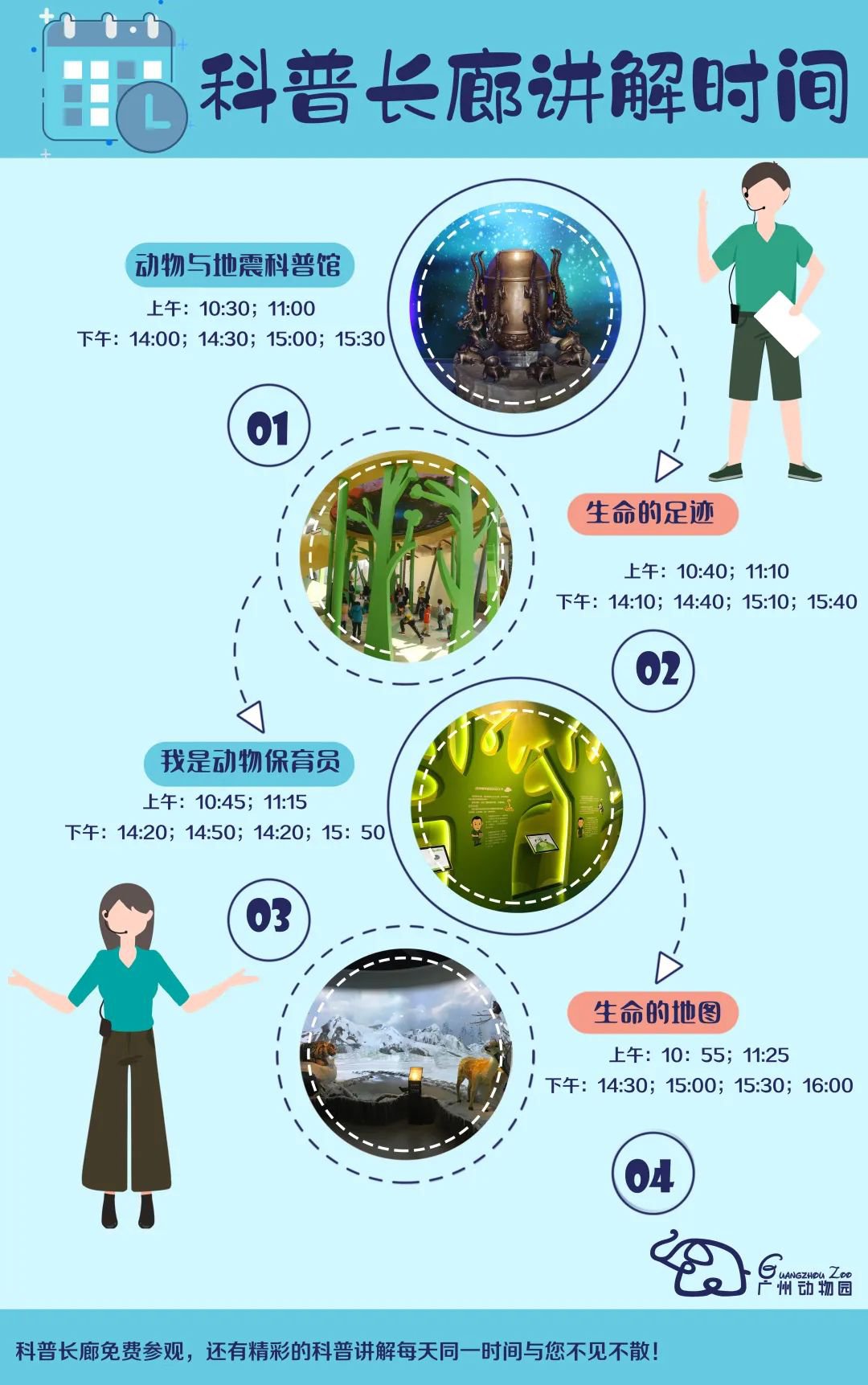 科普长廊四大展馆免费参观,每天还有专业科普讲解员为您讲述动物生命的奥秘,请留意讲解时间哟!