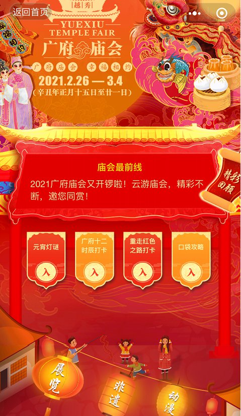 本次庙会设置了广府庙会活动主页微信小程序,布置固定主题模块的静态展示,包括文艺展览、非遗展示、动漫资源、游船资讯、慈善活动、往届庙会精彩回顾、抗疫小贴士、商贸等多个模块,全方位呈现充满广府特色的优秀文化资源。