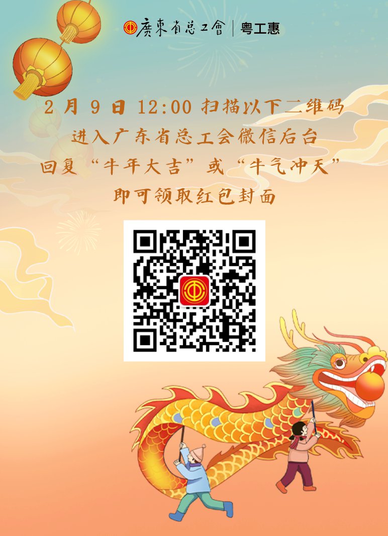 在新年即将到来之际,粤工惠又来给大家送福利啦!限量发放8款粤工惠新春红包封面。2 月 9 日 12:00 开始领取,非会员也可领!微信关注“广东省总工会微信公众号”,进入后台回复关键词:“牛年大吉”或“牛气冲天”,领取红包封面。先到先得,领完即止。专属定制的红包封面,让你的拜年更有范儿~