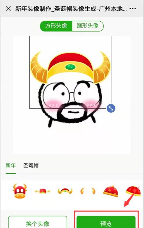 三、添加头像后,可以选择喜欢的帽子、头饰等,点击帽子即可进行调整,调整到合适的位置后点击“预览”