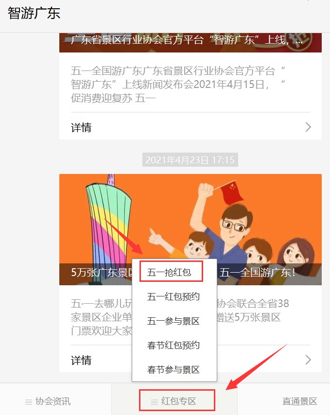 抢红包入口:关注“智游广东”微信公众号,点击菜单栏“红包专区-五一抢红包”