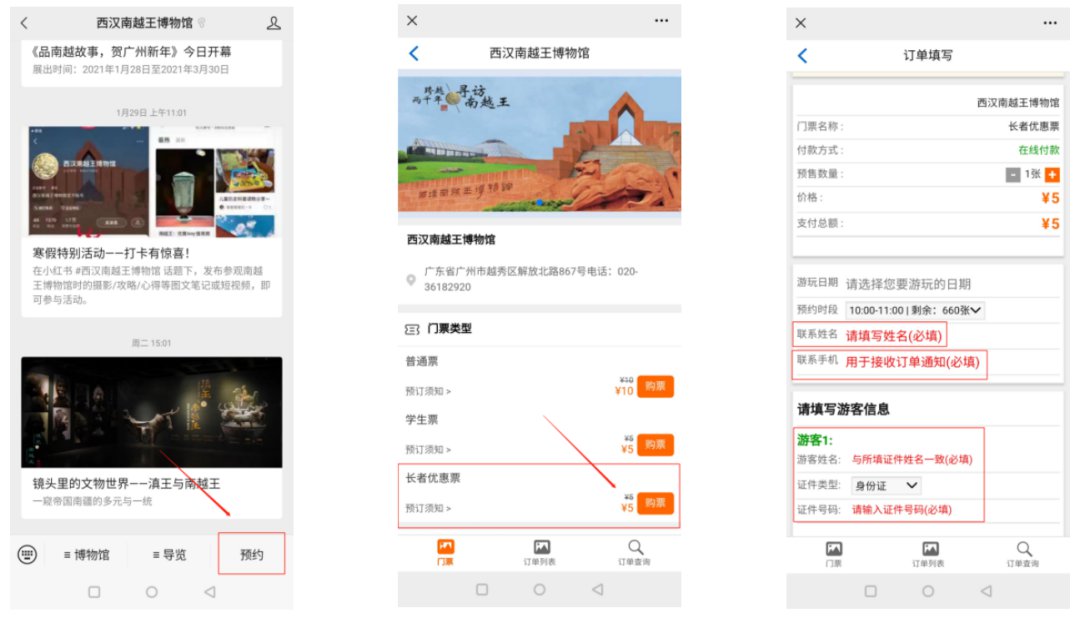 门票:参观请关注“西汉南越王博物馆”微信公众号,在下拉菜单进入预约系统进行线上预约(需填写姓名、手机号码、身份证号码等信息)。此外,也可现场在售票处凭有效证件领票参观。