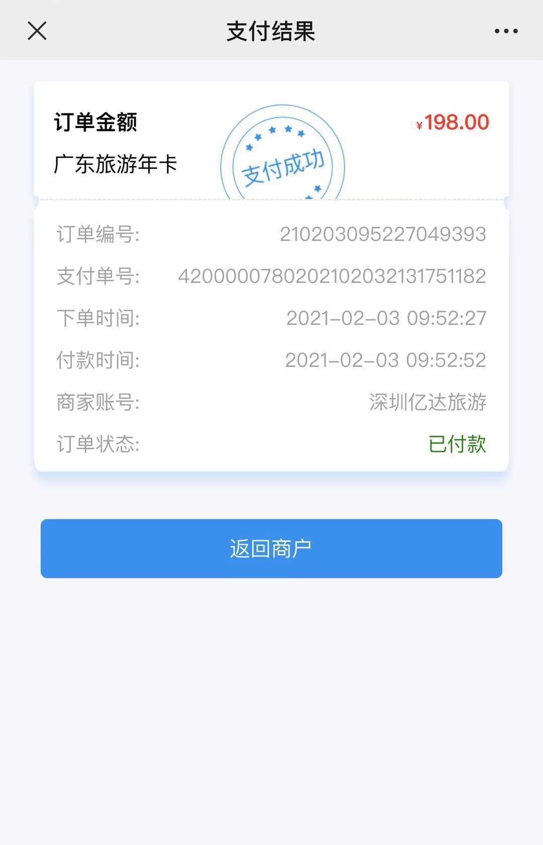 2、付款成功后点击“返回商户”然后开通年卡(或者在公众号点击“激活年卡”),填写激活码、身份资料,最后上传照片即开通成功;