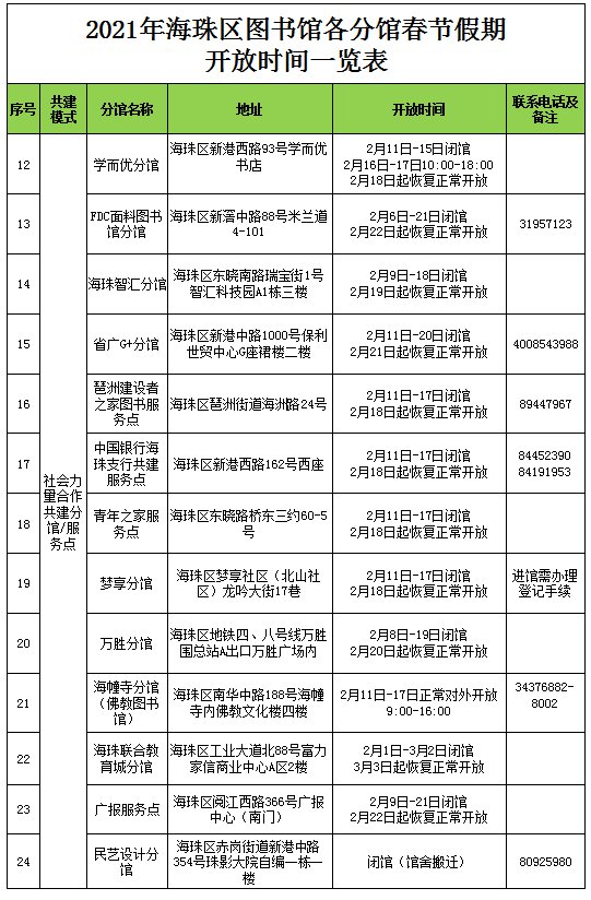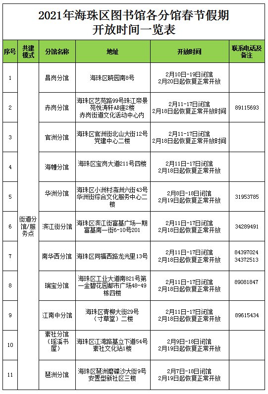 2021广州海珠区图书馆总分馆春节开放安排一览