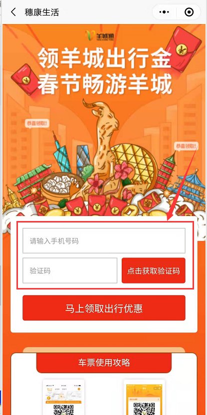 二、点击“羊城出行金”,按照提示填写手机号及相关信息,即可领取