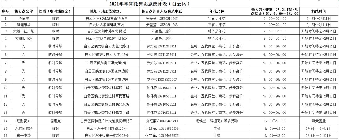 白云区16个年花售卖点,包括年桔、菊花、蝴蝶兰、桃花等春节主流花卉品种