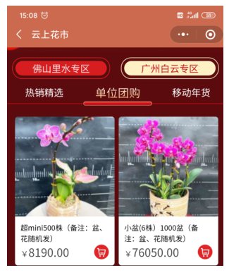 可按照以下两种方式进入云上花市小程序首页界面,点击“广州白云专区”按钮即可进入看到3个产品列表,有热销精选、单位团购、移动年货可以选择。