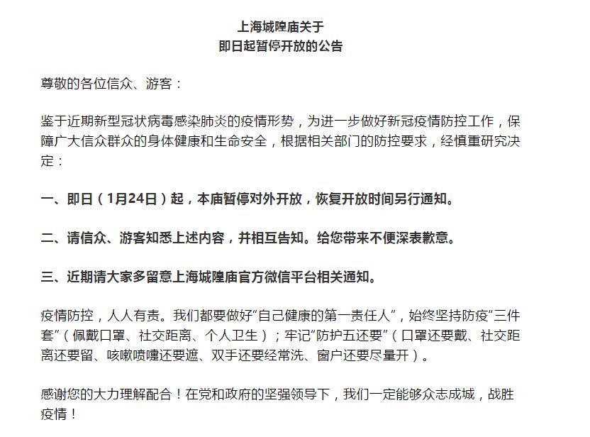 1月24日,上海城隍庙道观发布公告称,为进一步做好新冠疫情防控工作,保障广大信众群众的身体健康和生命安全,1月24日起,上海城隍庙暂停对外开放,恢复开放时间另行通知。
