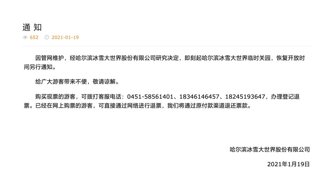1月19日,哈尔滨冰雪大世界官网发布公告,因管网维护,经哈尔滨冰雪大世界股份有限公司研究决定,即刻起哈尔滨冰雪大世界临时关园,恢复开放时间另行通知。