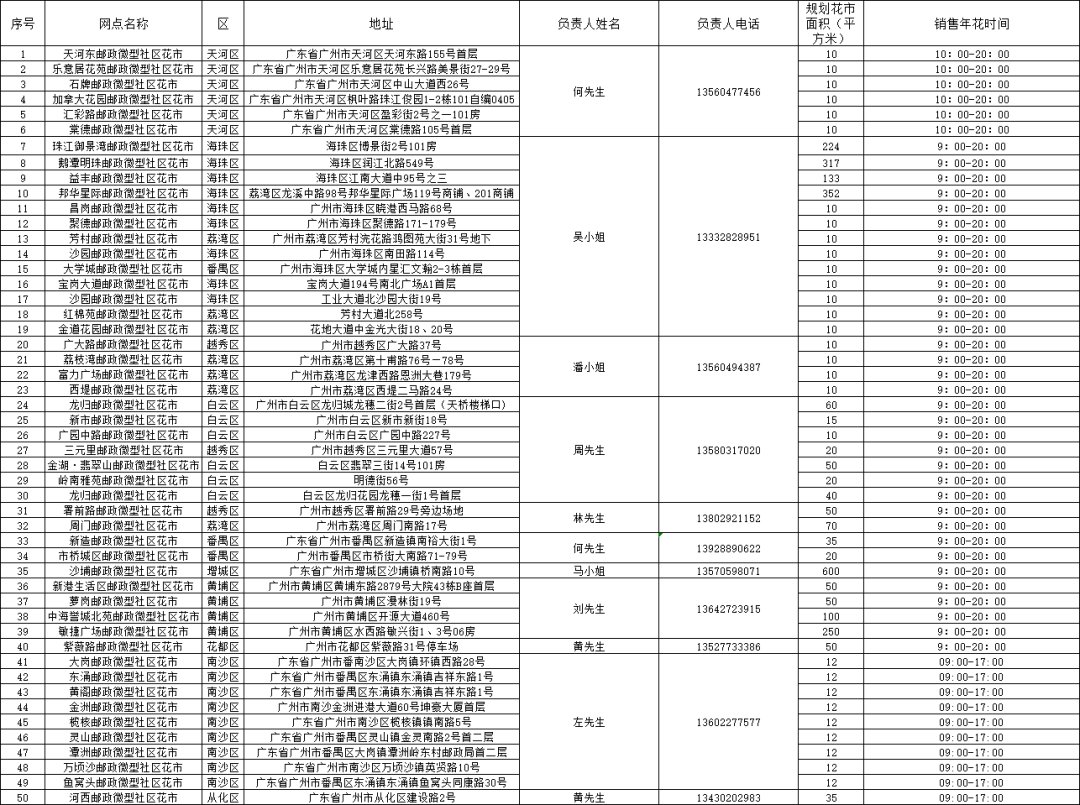 2021年广州邮政社区微花市开始招商啦,本次有50个位于不同行政区的网点可以提供场地给花农进行现场销售。广州邮政社区微花市预计于2月5日开始,持续到2月11日18:00,为期7天。