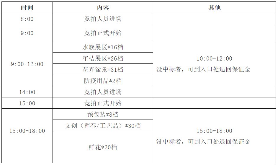 2021年广州市从化区迎春花市设在风云岭坪地公园举办,开放时间为2021年2月5日上午9:00至2月10日23:00,为期6天。本届花市设9mx3m年桔展区26个,3mx3m鲜花展区20个、3mx3m文创(挥春/工艺品)30个、3mx3m水族展区16个、3mx6m花卉盆景区31个,3mx3m预包装食品(饮料)档8个,3mx3m防疫用品售卖区2个,3mx6m特色品牌展区8个,3mx3m公益展区7个共计148档,采用举牌竞价形式,实行价高者得方式进行招租,中标者可于2021年2月4日9:00后凭证进场布置,不得提前进场。