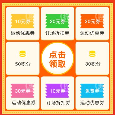 首次扫描场馆现场的群体通海报二维码,也可获得新用户大礼包一份(内含10、20、30元运动优惠券各一张)。
