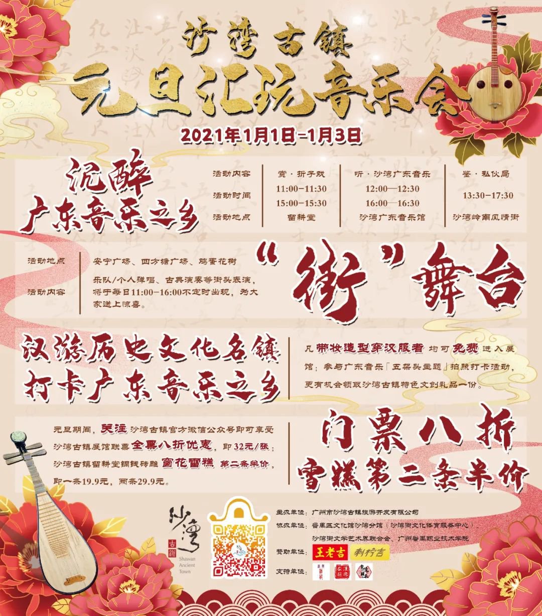 沙湾古镇作为广东音乐发源地之一,沉淀百年音乐氛围,在2017年获评国家AAAA级旅游景区,景区内著名岭南建筑“留耕堂”在2019年被评为“国家重点文物保护单位”。沙湾古镇多年来专注打造文化及独有品牌活动,成为众多文化企业、团队的孵化地。在即将到来的2021年元旦假期,结合汉服游古镇、音乐游古镇主题,举行“2021沙湾古镇元旦汇玩音乐会”活动。汇集传统的广东音乐、古琴演奏、折子戏、现代流行乐队演奏等,展示一个有文化而又年轻活力的沙湾古镇。