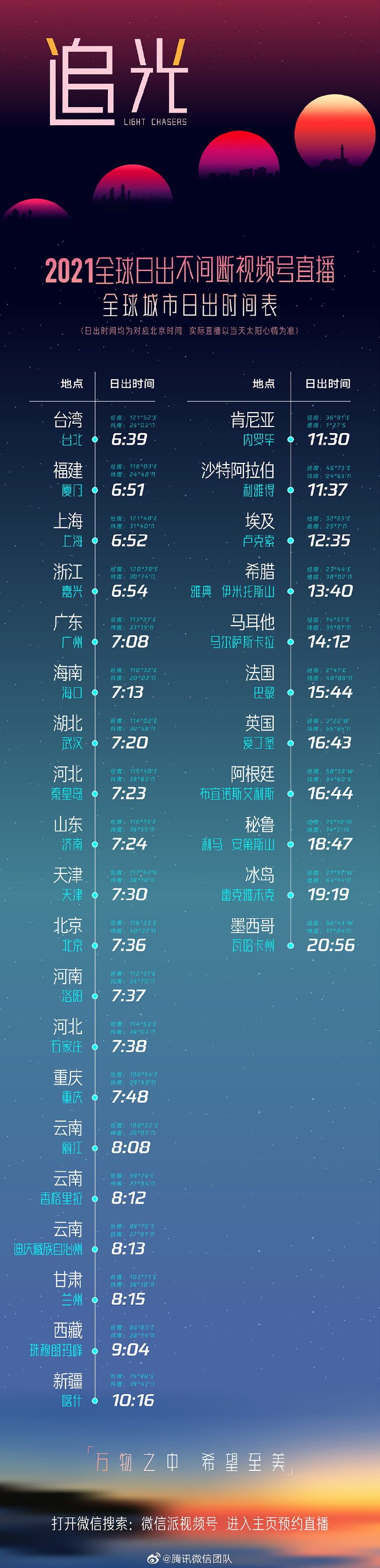 为了迎接崭新的 2021,微信将在 2021年1月1日清晨6点起,在微信视频号发起为时 15 小时的“追光”全球日出不间断直播活动,用直播的方式记录下这个世界平常却充满力量的瞬间,拥抱新年的第一束光。