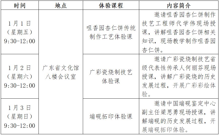 一颗圆圆的杏仁饼是如何打成的?瓷器上精美的图案是如何绘制出来的?古人书房里必不可少的砚台究竟有什么秘密?广东省非物质文化遗产保护中心将于2021年元旦期间(1月1日至3日)推出三场非遗体验课,邀请相关行业专家及非遗传承人为广大市民朋友揭开这些非遗项目的神秘面纱,大家可以根据个人爱好选择体验课程。