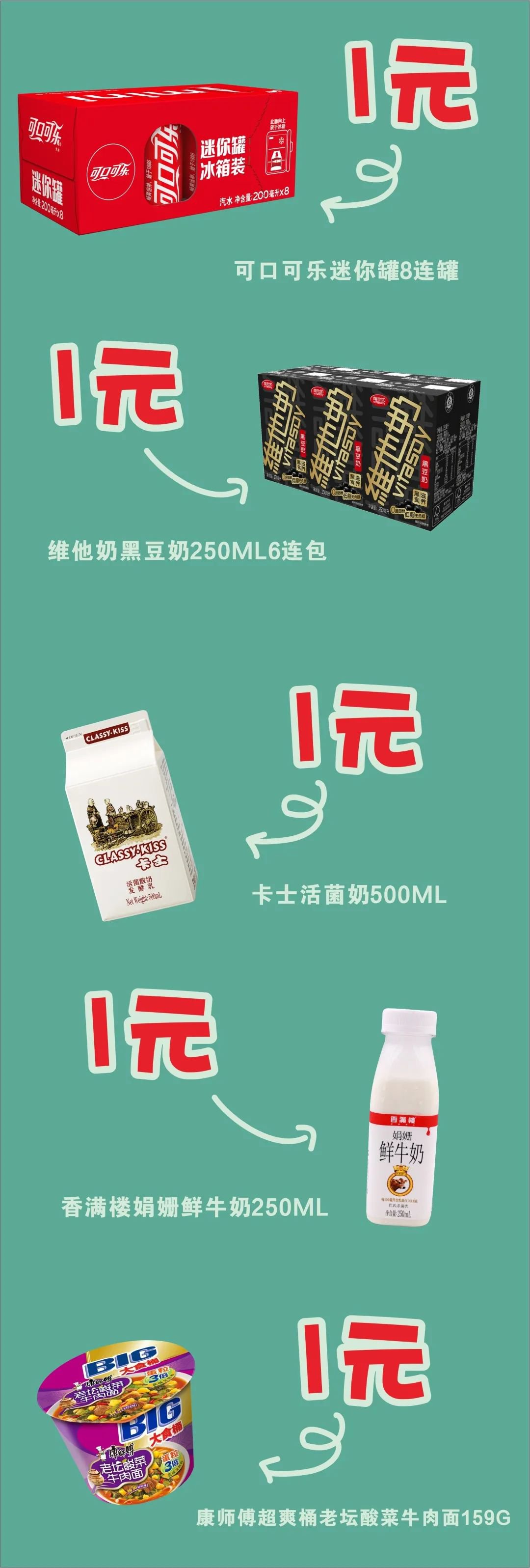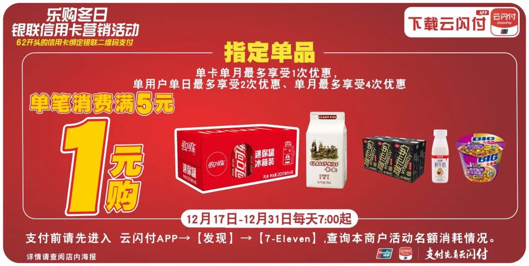 1.12月17日-12月31日,用户在广东7-Eleven指定门店使用银联二维码支付,单笔消费满5元,即有机会在同一笔订单内享受1元加购以下单品:维他奶黑豆奶250ML6连包,可口可乐迷你罐8连罐,卡士活菌奶500ML,香满楼娟姗鲜牛奶250ML,康师傅超爽桶老坛酸菜牛肉面159G。