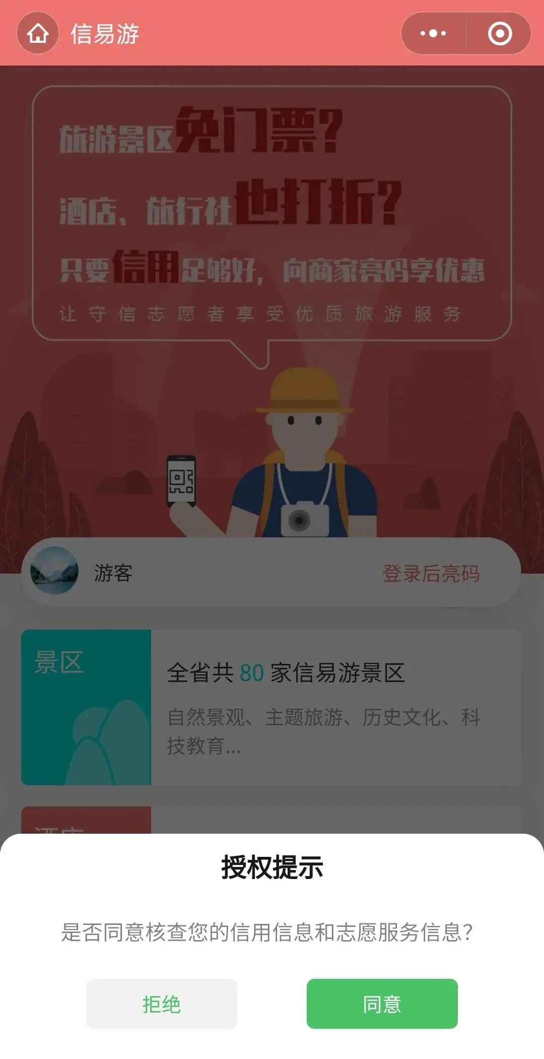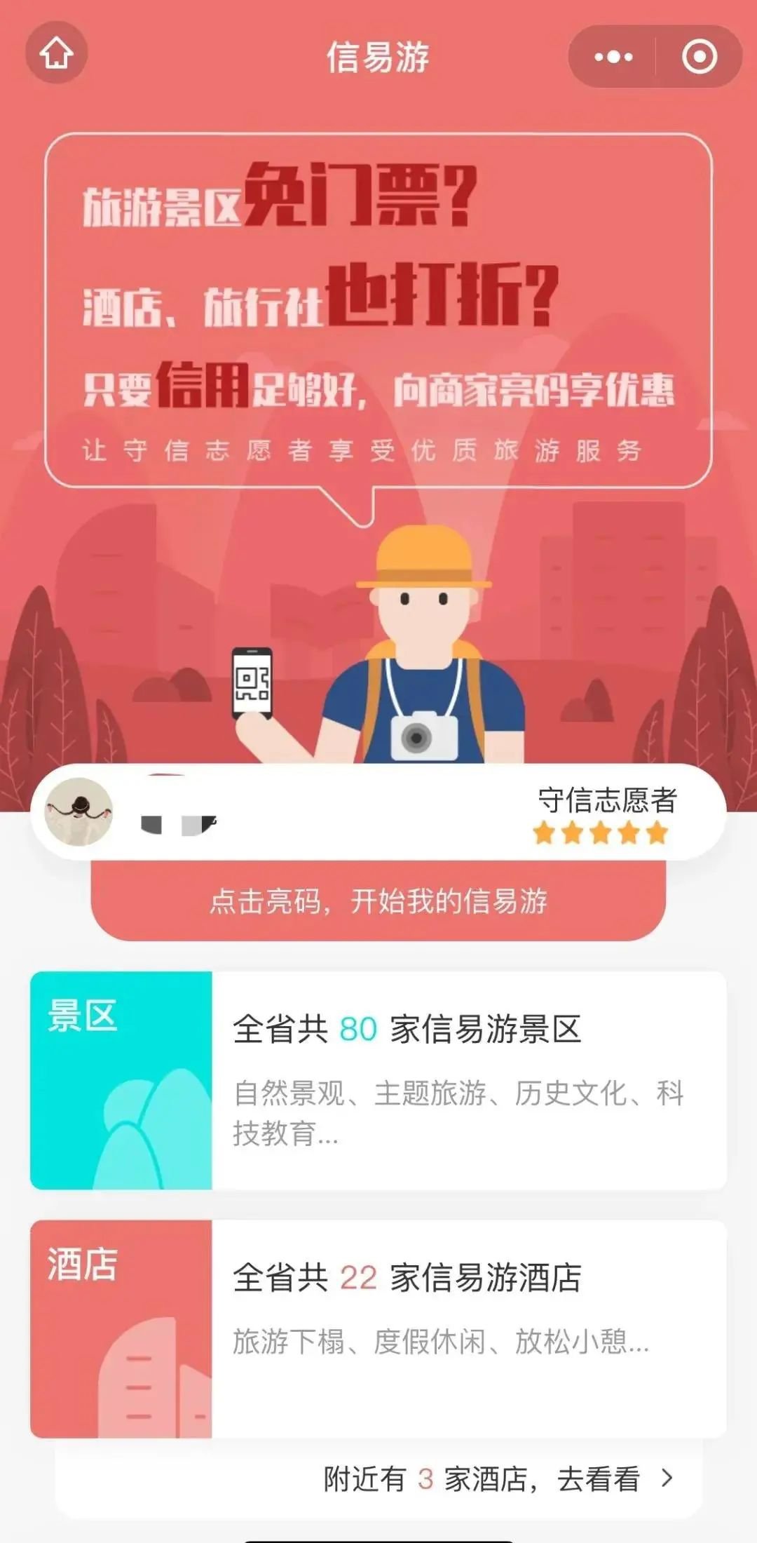 登录成功后“点击亮码,开始我的信易游”,显示守信志愿者身份信息,并向景区、酒店、旅行社工作人员出示,即可现场享受守信激励优惠