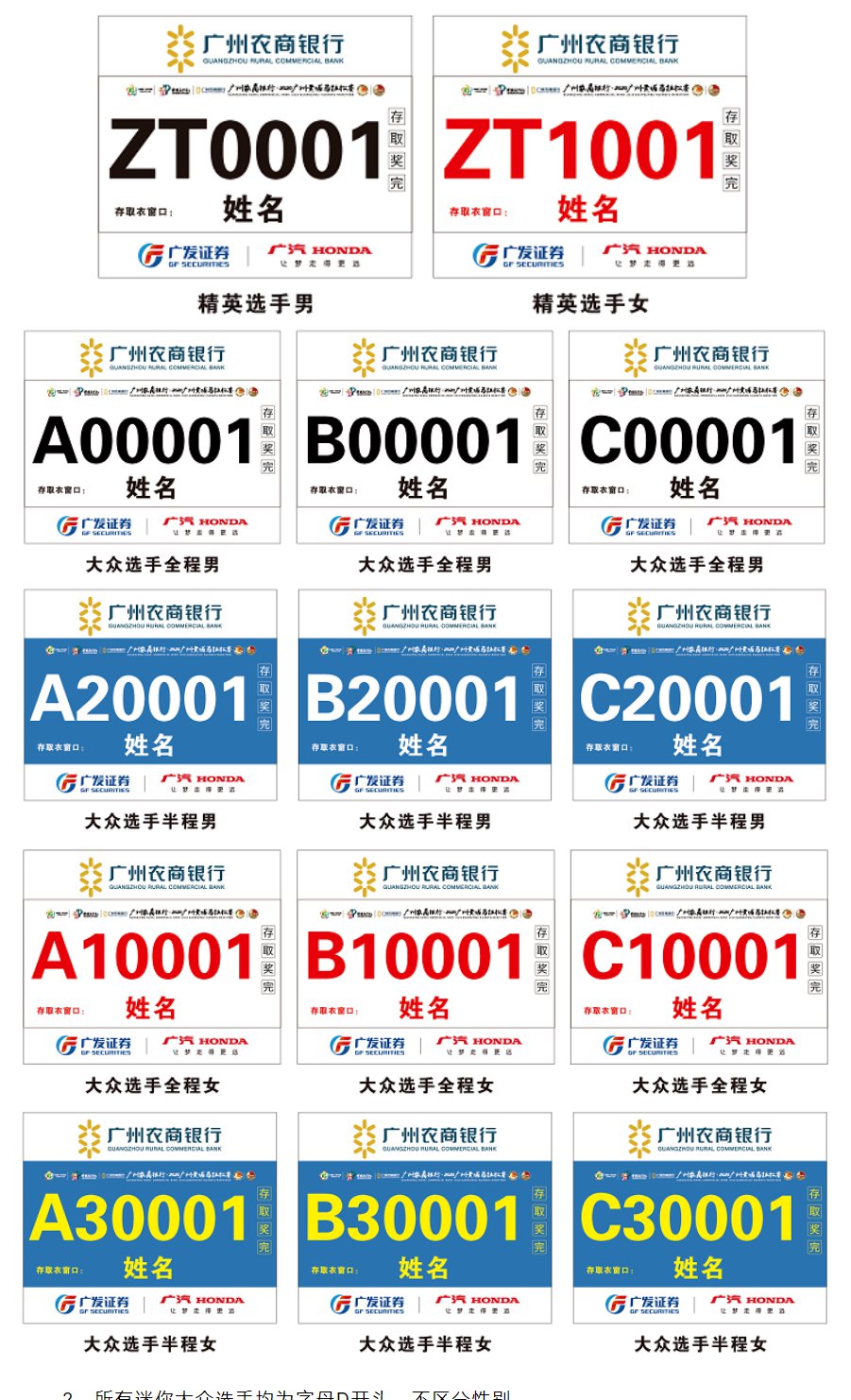 1、号码由分区字母加四位(精英)或五位(大众)数字组成,首字母代表选手所属分区,马拉松项目及半程马拉松项目普通选手字母后第一个数字代表参赛项目及性别,其中0为全程男子,1为全程女子,2为半程男子,3为半程女子。