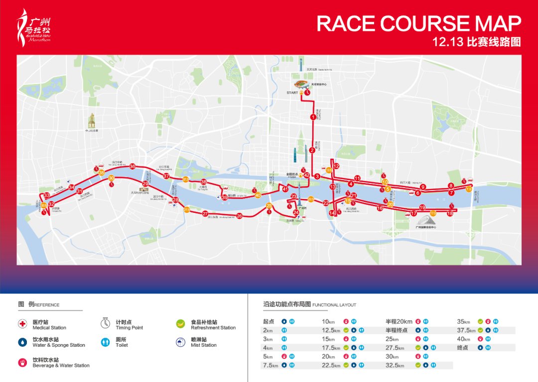 2020广州马拉松赛将于12月13日(星期日)鸣枪起跑,比赛设马拉松项目,起跑时间为7:30,关门时间为13:45。比赛路线基本沿用“一江两岸”的路线设置,起点设在天河体育中心,终点设在花城广场。今年组委会对赛道进行了优化,调整了天河区、海珠区和越秀区部分赛道。路线微调后,已经中国田径协会派遣国际丈量员丈量确认,符合中国田协金牌赛事和世界田联金标赛事认证标准。