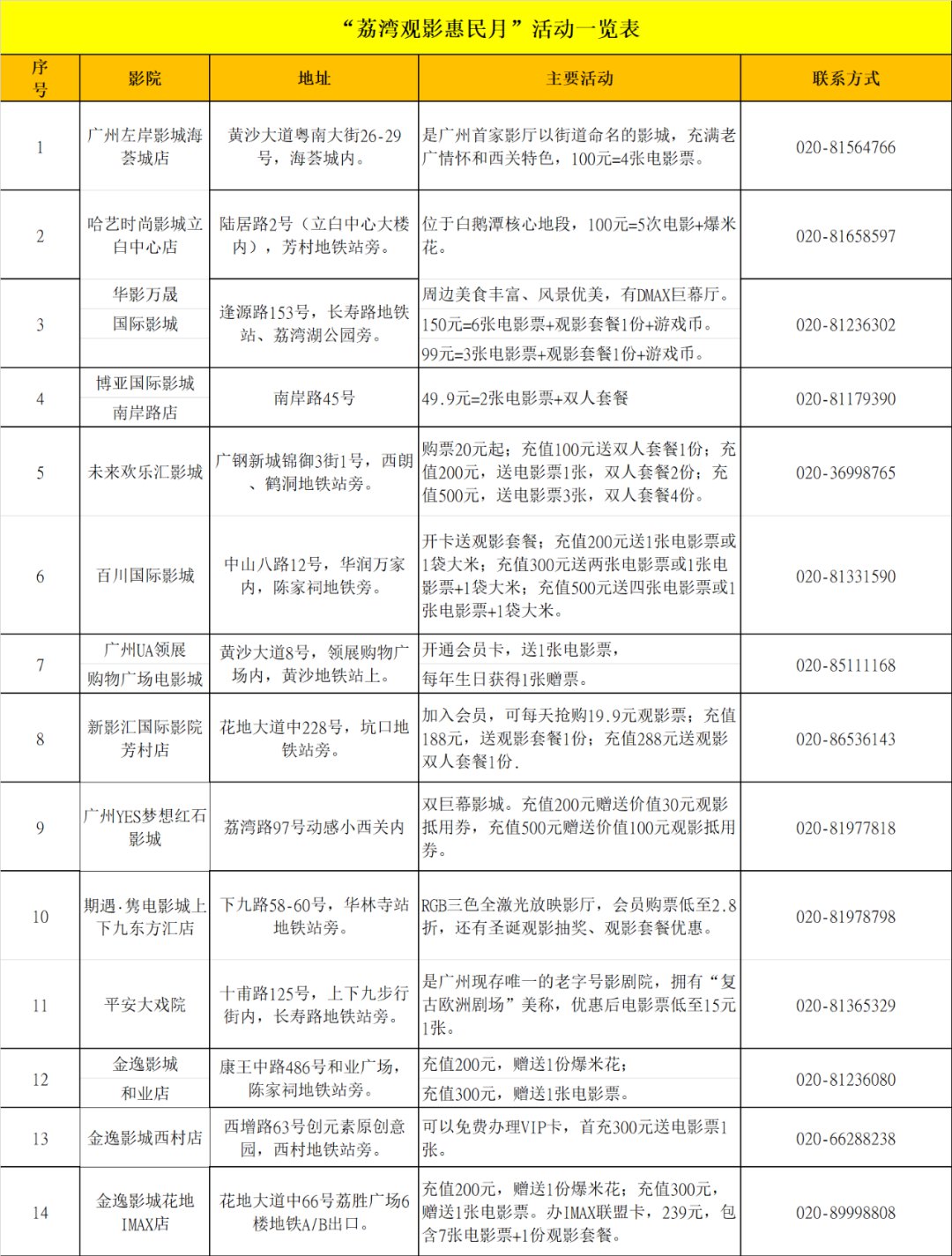 各大影院均推出各自最优惠的活动,如左岸影城海荟城店100元4张电影票,其影厅充满西关特色,“恩宁厅”、“康王厅”等;哈艺时尚影城立白中心店位于白鹅潭中心地段,一线临江,100元可观影5次电影,并赠送爆米花;其他影院活动可参考文末附表。