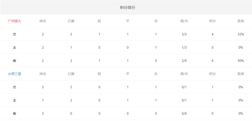 恒大在上轮比赛2-0战胜神户胜利船,取得了本赛季亚冠的首胜,球队士气提升不少,但神户胜利船已经提前小组出线,与恒大一役首发阵容并非全主力,恒大虽拿下比赛但过程并不轻松。目前恒大以1胜1平1负积4分的战绩暂列小组第二,水原三星在少赛一轮的情况下1平1负积1分,由于柔佛新山的退出,G组最后一个出线名额将在恒大与水原三星之间产生。