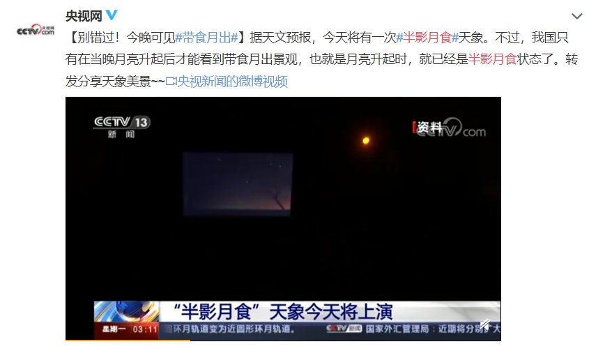据天文预报,今天将有一次半影月食天象。不过,我国只有在当晚月亮升起后才能看到带食月出景观,也就是月亮升起时,就已经是半影月食状态了。转发分享天象美景~~