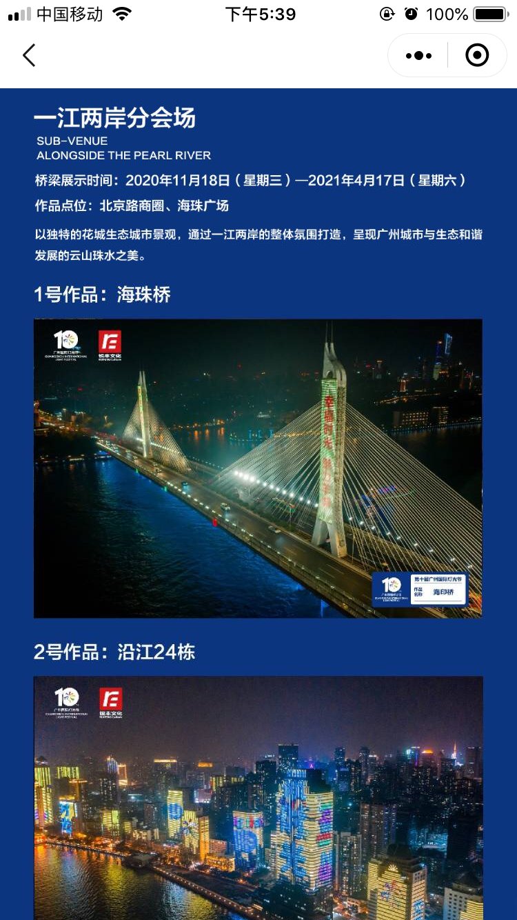 第十届广州国际灯光节于2020年11月18日至12月1日在广州举行。本次灯光节,包括主会场之一的花城广场、旧中轴分会场、琶醍分会场以及一江两岸分会场都将采用自由进场观展模式。而在海心沙主会场将延续以往的预约模式,需要提前预约。