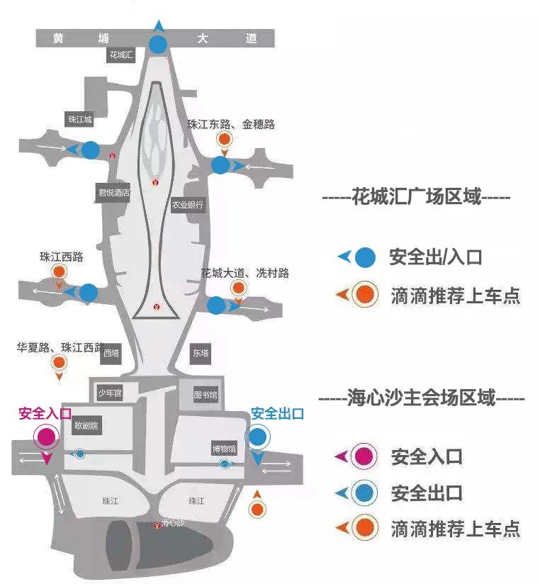 散场时请从安全出口就近前往珠江西路、珠江东路、金穗路、花城大道、冼村路、华夏路等方向。