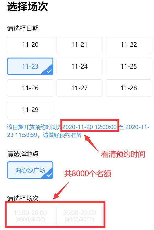 海心沙会场没有预约不能进去,如果想预约的时间约满了可以预约之后的场次。直至11月29日,海心沙每天均有门票可预约。需要注意的是,此前官方发布的预约开放时间为提前一天,但目前系统已显示可提前三天预约,大家切勿弄错预约时间哦。