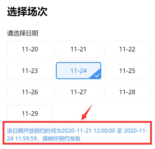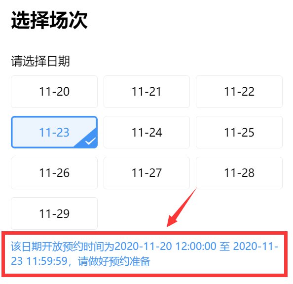 原定:11月15日上午9时至18日中午12时前可预约18日门票,之后采取逐日开放预约形式,预约开放时间为前一天的12:00(即11月18日中午12:00后开放19日预约,19日中午12:00后开放20日预约,以此类推)。