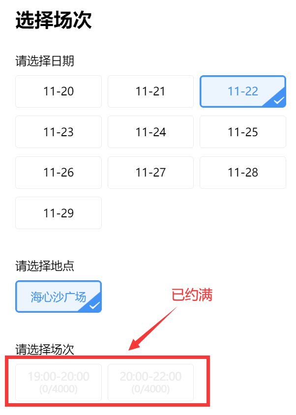 之前官方公布预约开放时间为前一天的12:00,不过小编发现11月18日已经可以预约20日及21日门票,且截至11月19日已全部约满。