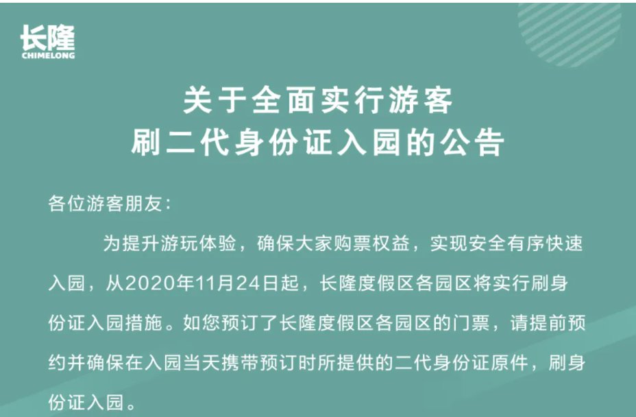 2020年11月24日 早上9点起,长隆旅游度假区各园区身份证入园正式启用: